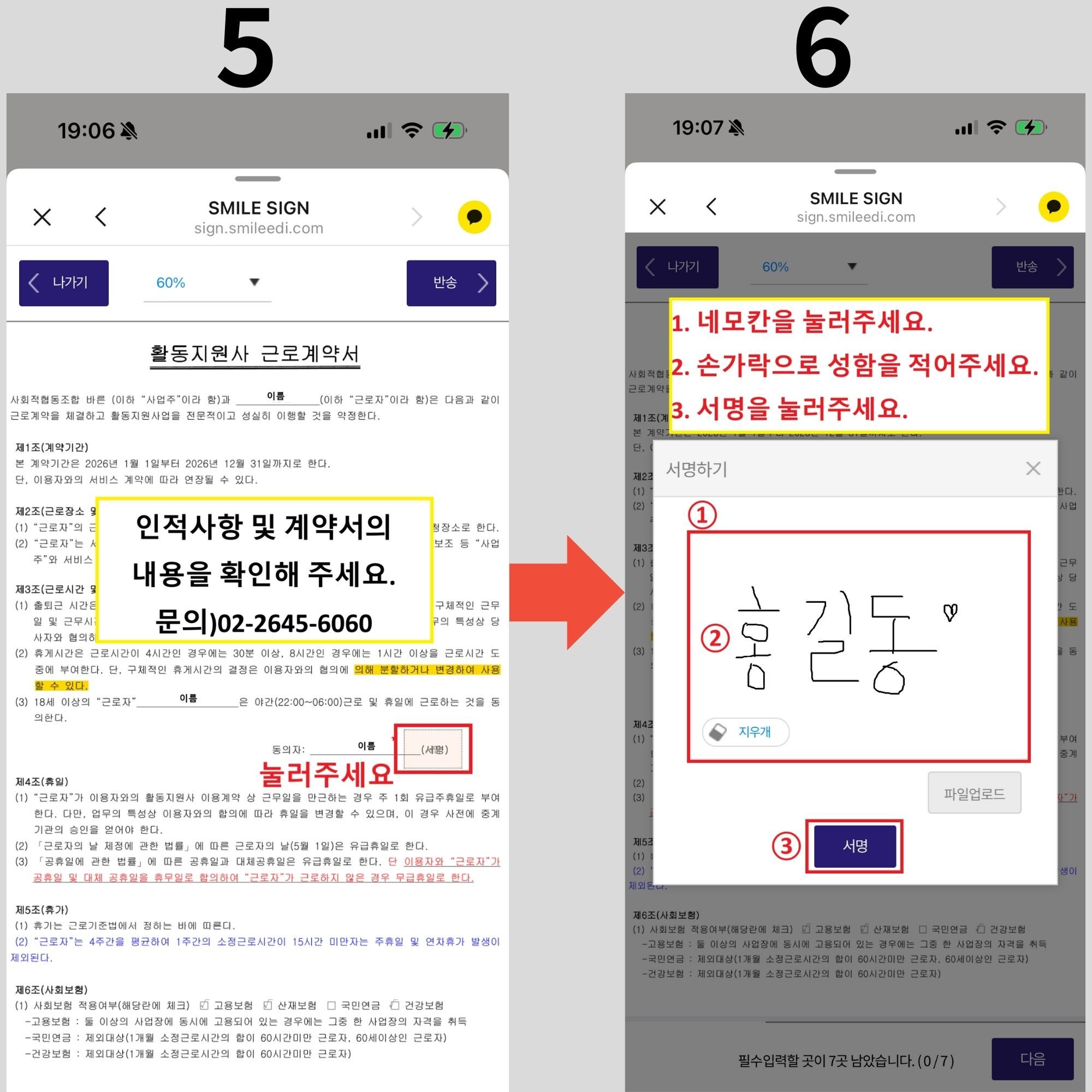 5. 본인의 인적사항 및 계약서 내용을 꼭 확인하시고 아래 서명을 눌러주세요.